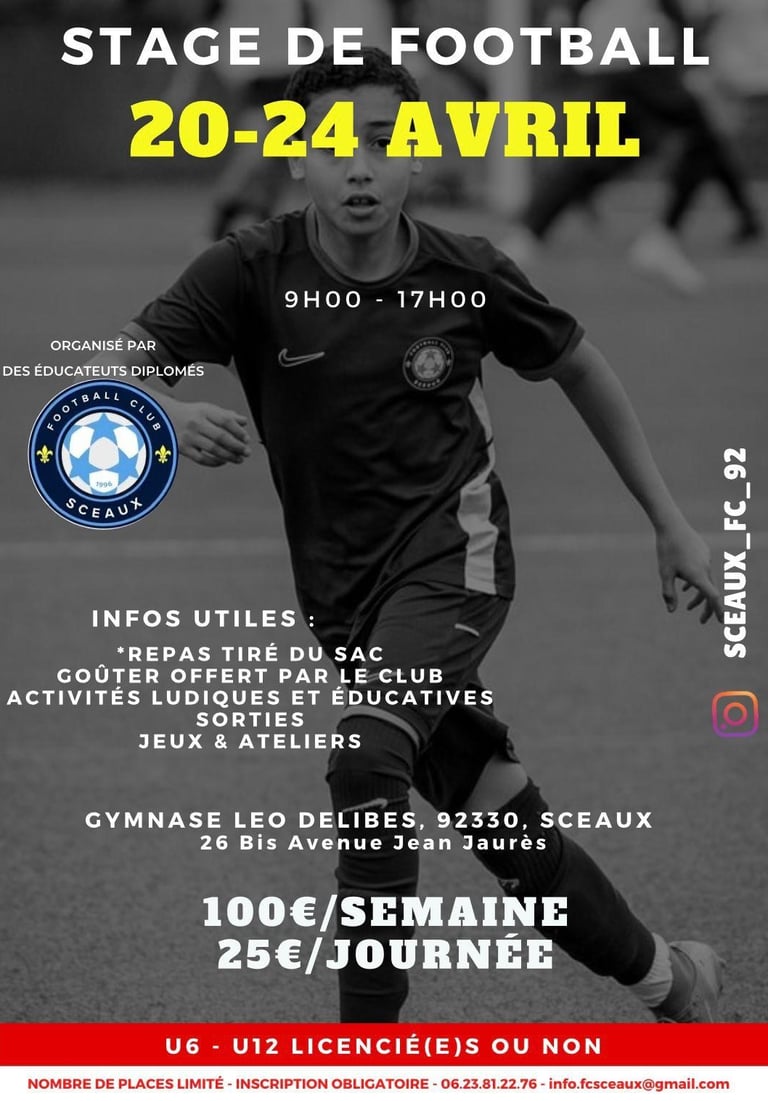 Le Football Club de Sceaux propose des stages de football durant les vacances scolaires afin de permettre aux jeunes de pratiquer une activité sportive encadrée, dans un cadre sécurisé, éducatif et structuré. Ces stages ont pour objectifs de maintenir et renforcer le lien social, de favoriser l’épanouissement des enfants et adolescents, et d’accompagner leur progression sportive grâce à l’intervention d’éducateurs qualifiés.