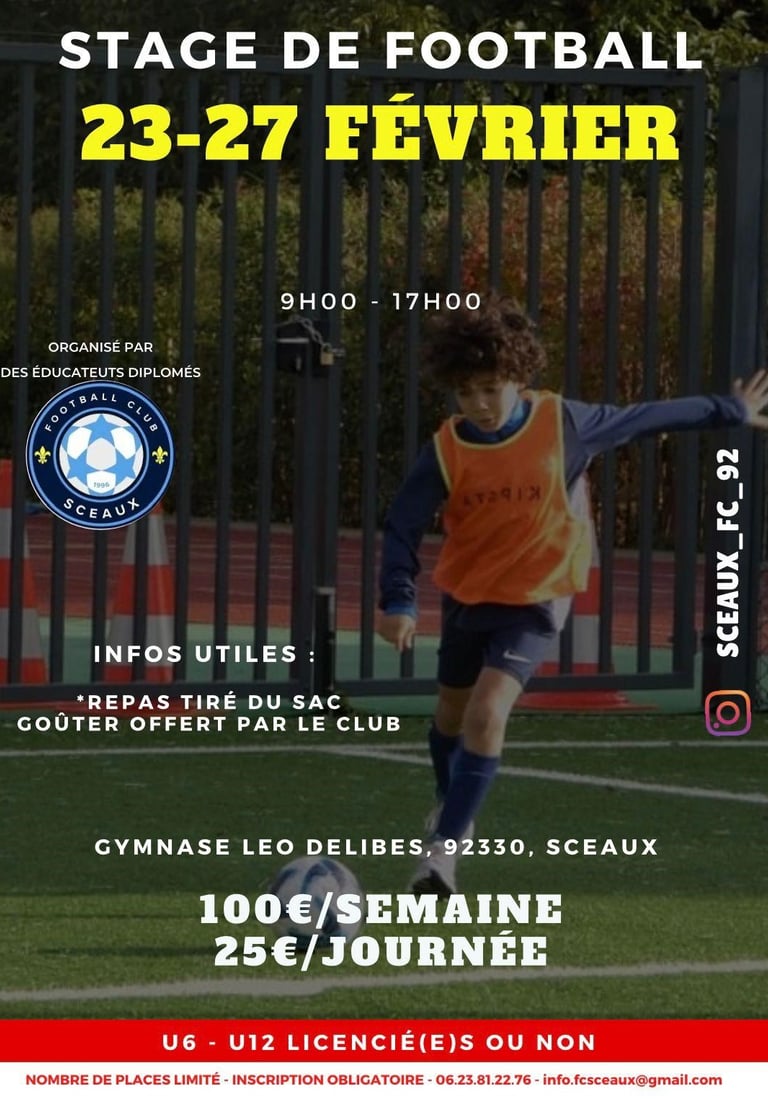 Le Football Club de Sceaux propose des stages de football durant les vacances scolaires afin de permettre aux jeunes de pratiquer une activité sportive encadrée, dans un cadre sécurisé, éducatif et structuré. Ces stages ont pour objectifs de maintenir et renforcer le lien social, de favoriser l’épanouissement des enfants et adolescents, et d’accompagner leur progression sportive grâce à l’intervention d’éducateurs qualifiés.
